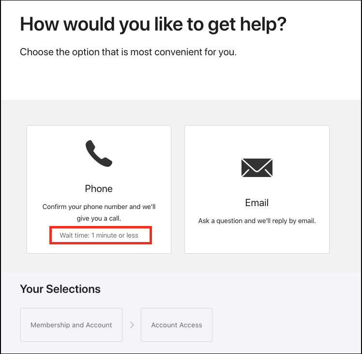 Dann wird Ihnen angeboten, per Telefonnummer oder E-Mail-Adresse kontaktiert zu werden. Häufig wird Ihnen ein Rückruf innerhalb einer Minute angeboten.