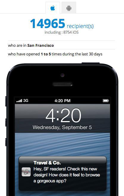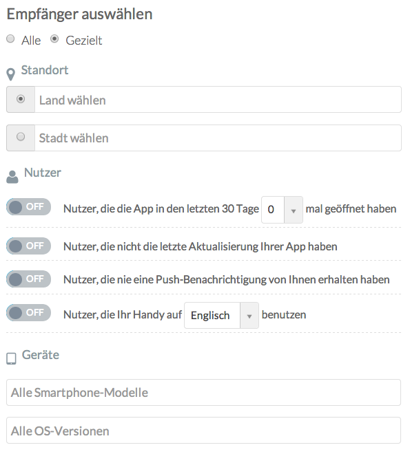 Zusätzlich zur Ortszeit-Option, können Sie Ihre Nutzer nach Betriebssystem, Sprache, Nutzungshäufigkeit, usw. eingrenzen.