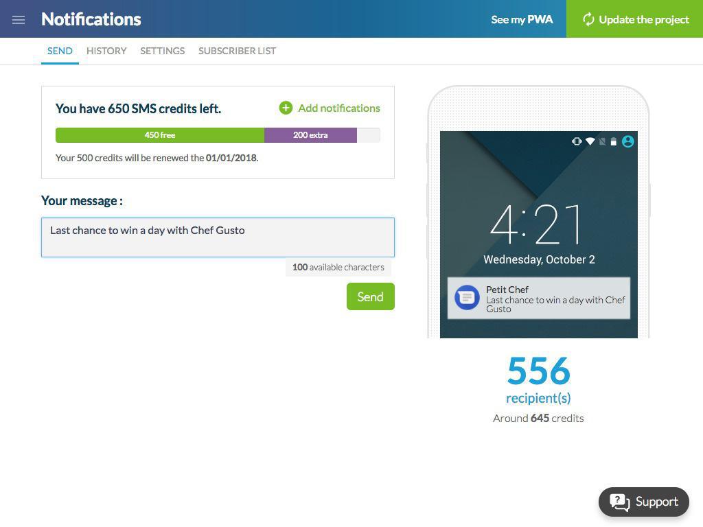 Es gibt keine geografische Begrenzung für die Nutzung Ihrer Progressive Web App. Potenziell können Sie Nutzer auf der ganzen Welt haben, die sich für den Erhalt von SMS-Benachrichtigungen registrieren lassen wollen. Das von uns entwickelte Abrechnungssystem wird die Preisunterschiede je nach Land, in das die SMS gesendet wird, auf intelligente Weise verwalten. Sie werden für jedes Land den jeweils günstigsten Preis bezahlen.