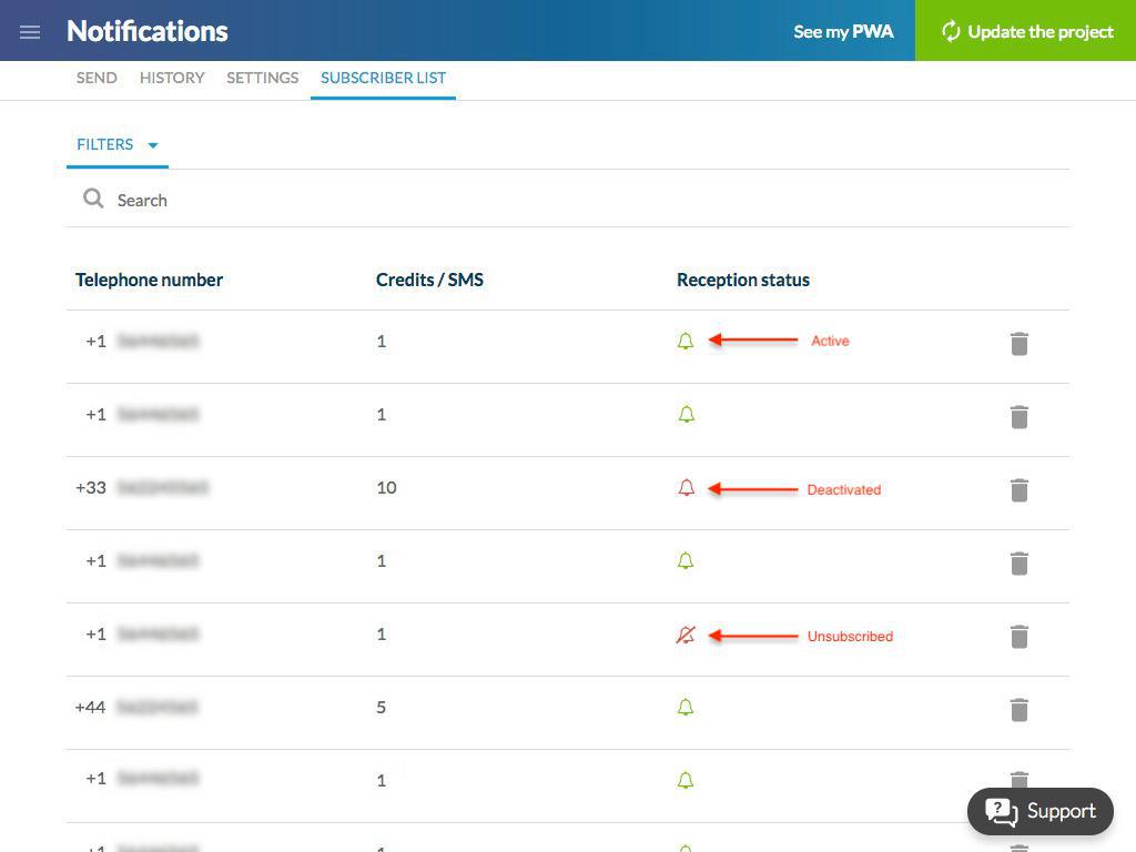 In dieser Liste können Sie auch die Nutzer identifizieren, die sich vom Benachrichtigungsdienst abgemeldet haben. Dies sind Telefonnummern, deren Empfangsstatus durch ein durchgestrichenes rotes Icon dargestellt wird. Diese Nutzer haben STOP per SMS gesendet, um sich abzumelden.