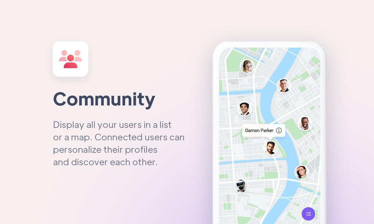 Das Add-ons "Gemeinschaft" ist ein sehr nützliches Werkzeug, da es Ihnen ermöglicht, die Liste der registrierten Nutzer Ihrer Anwendung sichtbar zu machen. Auf diese Weise können sich die Nutzer gegenseitig entdecken. Sie können auch wählen, wie der Bereichskategorien angezeigt werden soll, entweder in Form einer Liste, in der die Nutzer nach verschiedenen Kategorien sortiert sind, oder als Map, die den Standort jedes Nutzers anzeigt. Jeder Nutzer hat natürlich das Recht zu entscheiden, ob sein Profil öffentlich oder privat sein soll und ob seine Informationen für die Gemeinschaft sichtbar gemacht werden sollen.