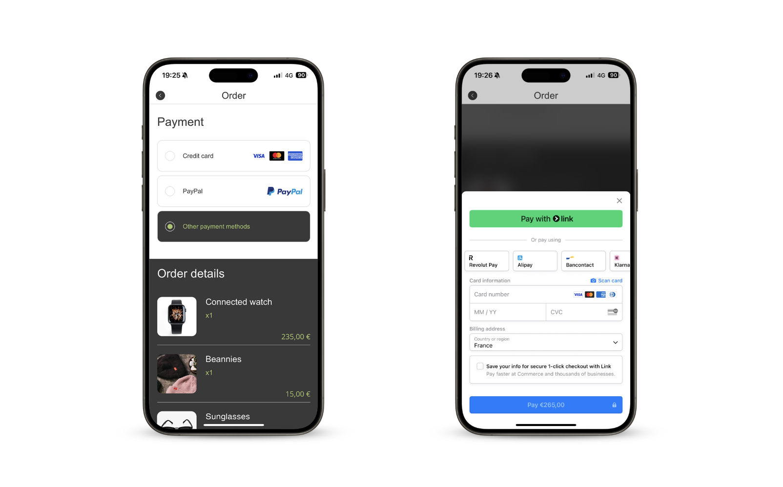 Sobald Ihre Auswahl gespeichert ist, stehen sie automatisch im Checkout-Prozess Ihrer App zur Verfügung. Ihre Kunden sehen die neuen Optionen und können ihre Bestellung mit der ihnen vertrauten Zahlungsmethode bezahlen.