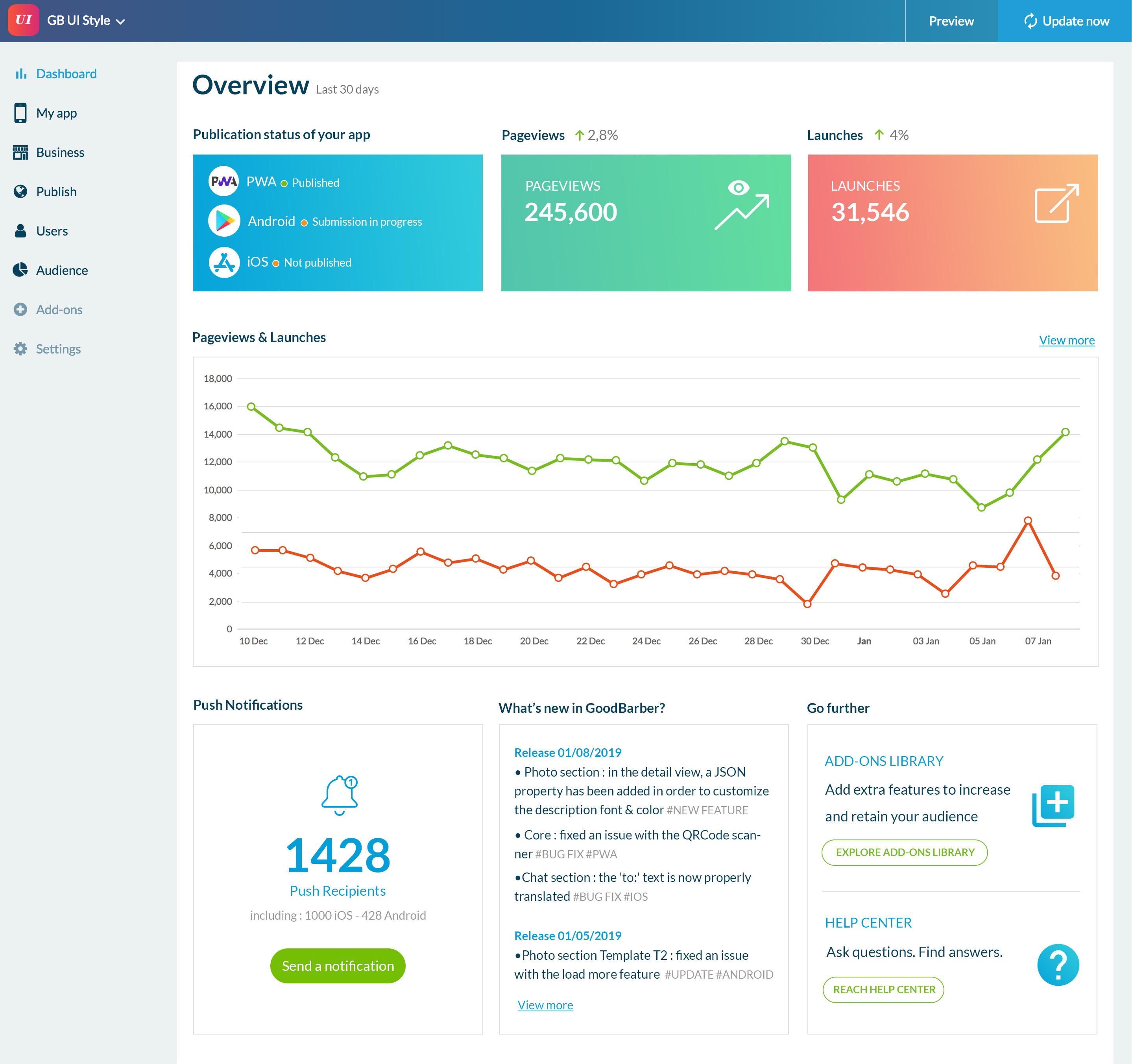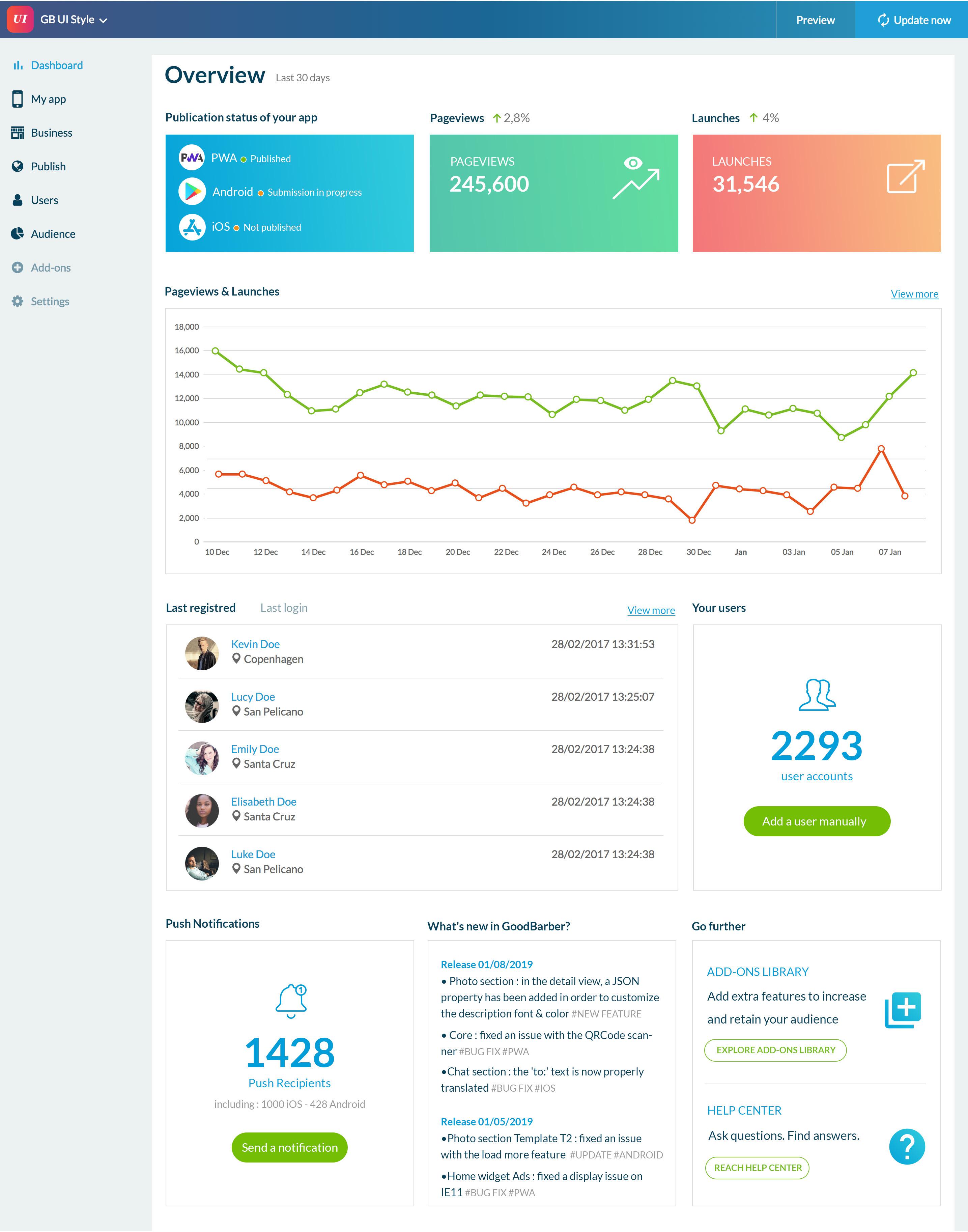 Ihr neues Dashboard bietet Ihnen neue Funktionen und einen Überblick über Ihre App, um Ihre Produktivität zu steigern. Im Handumdrehen haben Sie Zugriff auf die wichtigsten Informationen über die Aktivitäten Ihrer App und die durchgeführten Operationen. Dynamisch abhängig von Ihrem Abonnement und den aktivierten Add-ons, wurde es so gestaltet, dass es Ihnen nur relevante Informationen anzeigt.