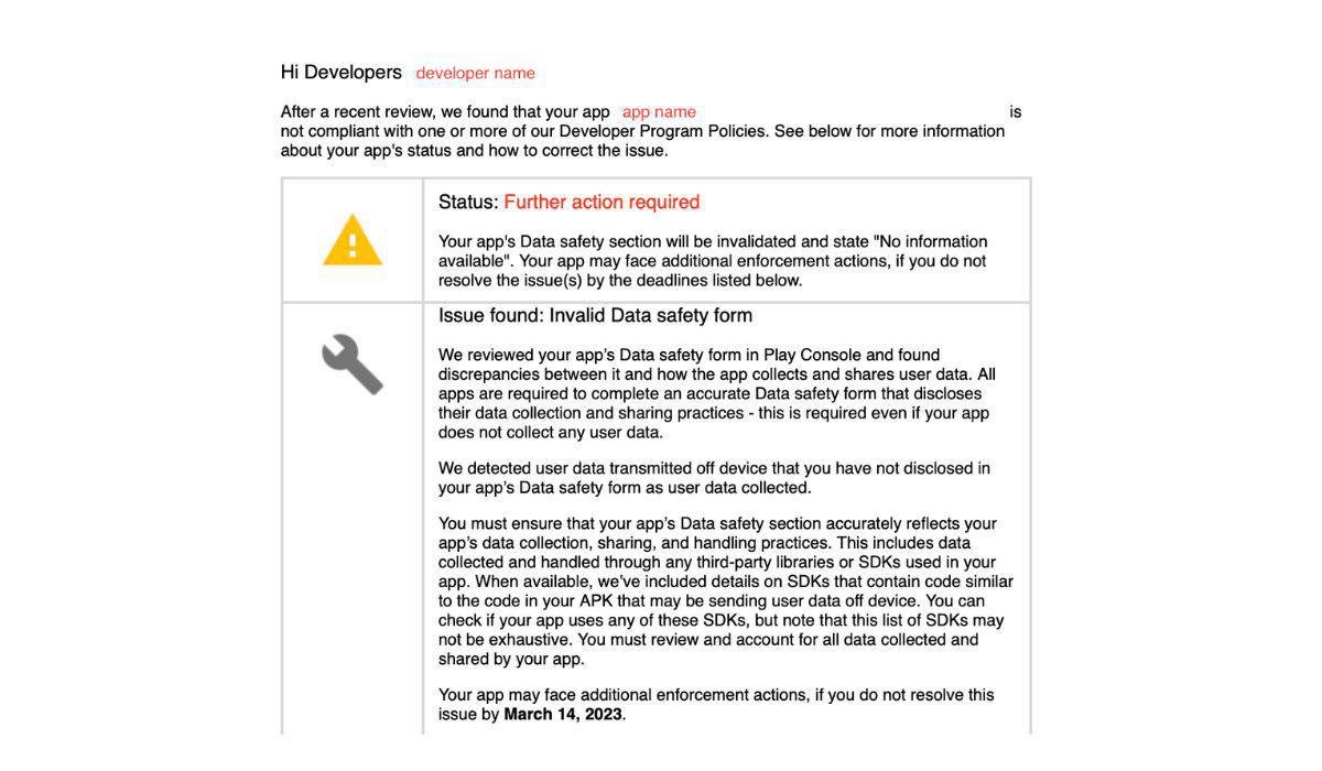 Im Jahr 2021 kündigte Google weitere Details für den Bereich "Datensicherheit" in Google Play an. Entwickler sind nun verpflichtet, Google über die Datenschutz- und Sicherheitspraktiken ihrer Apps zu informieren, indem sie ein Formular in der Play Console ausfüllen. Diese Informationen werden auf der Karteikarte Ihrer App angezeigt, damit die Nutzer von Google Play vor dem Herunterladen der App verstehen können, wie Ihre App die Daten der Nutzer sammelt und teilt.