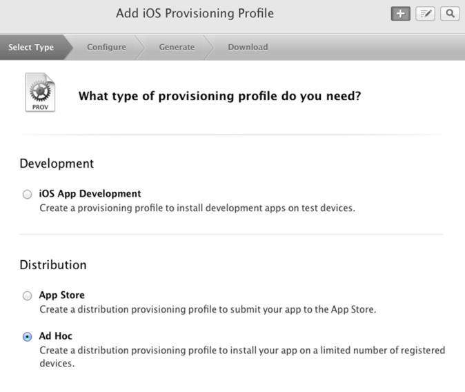 Um Ihre App mit der Ad Hoc Version zu testen, müssen sie der sogenannte Distribution - AdHoc Provisioning Profile generieren.