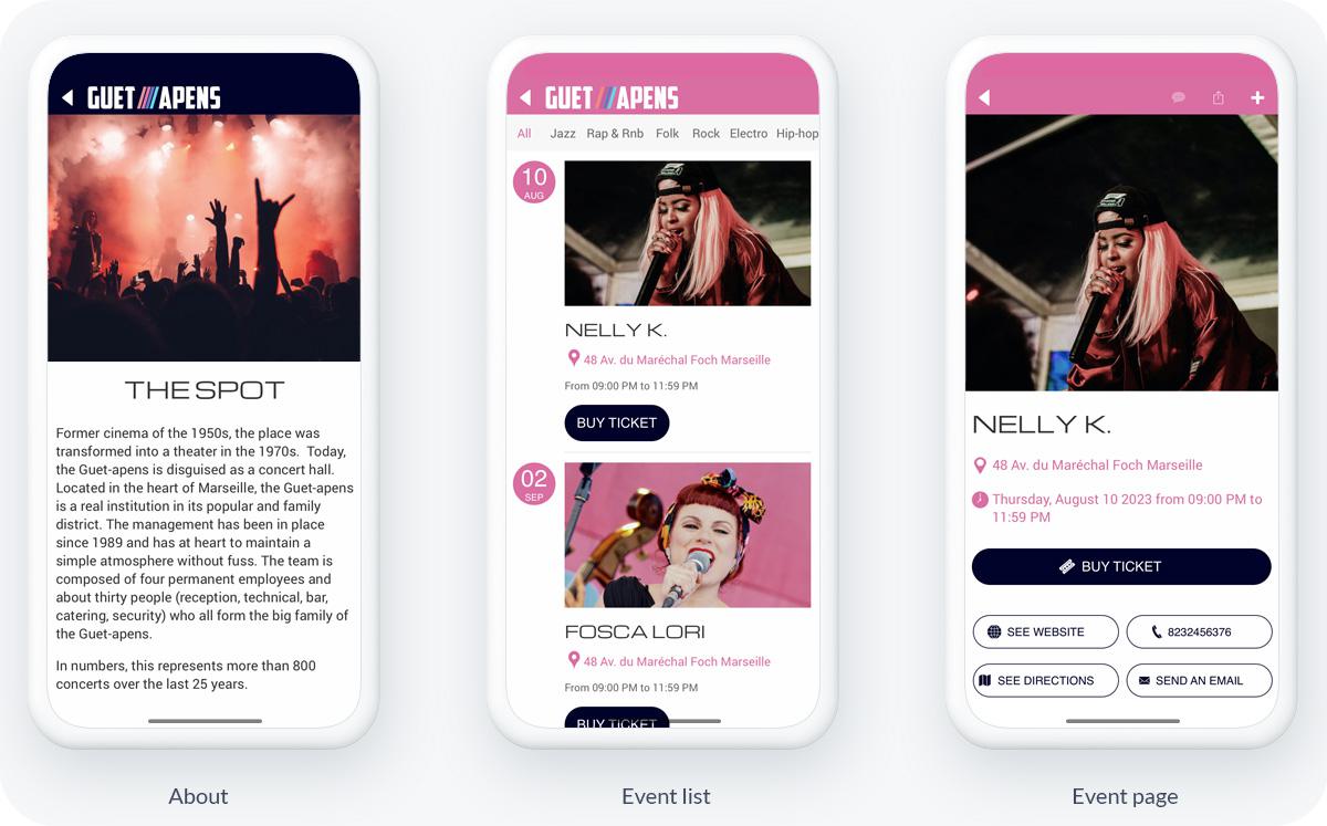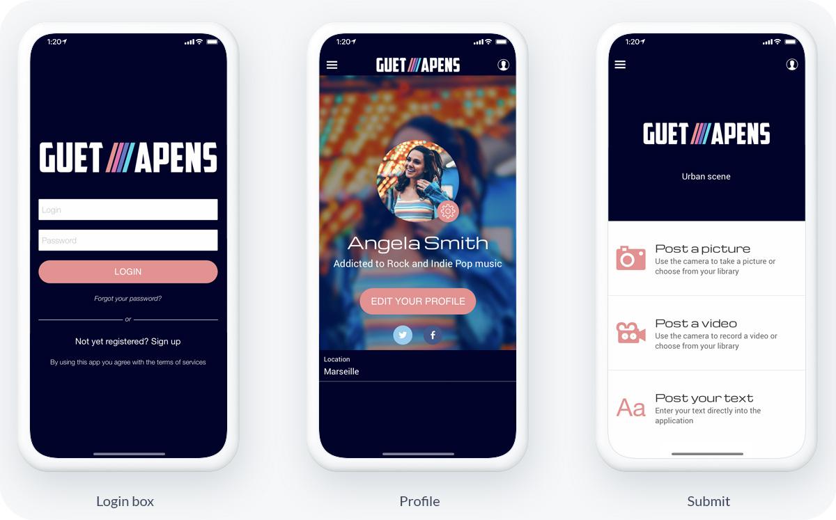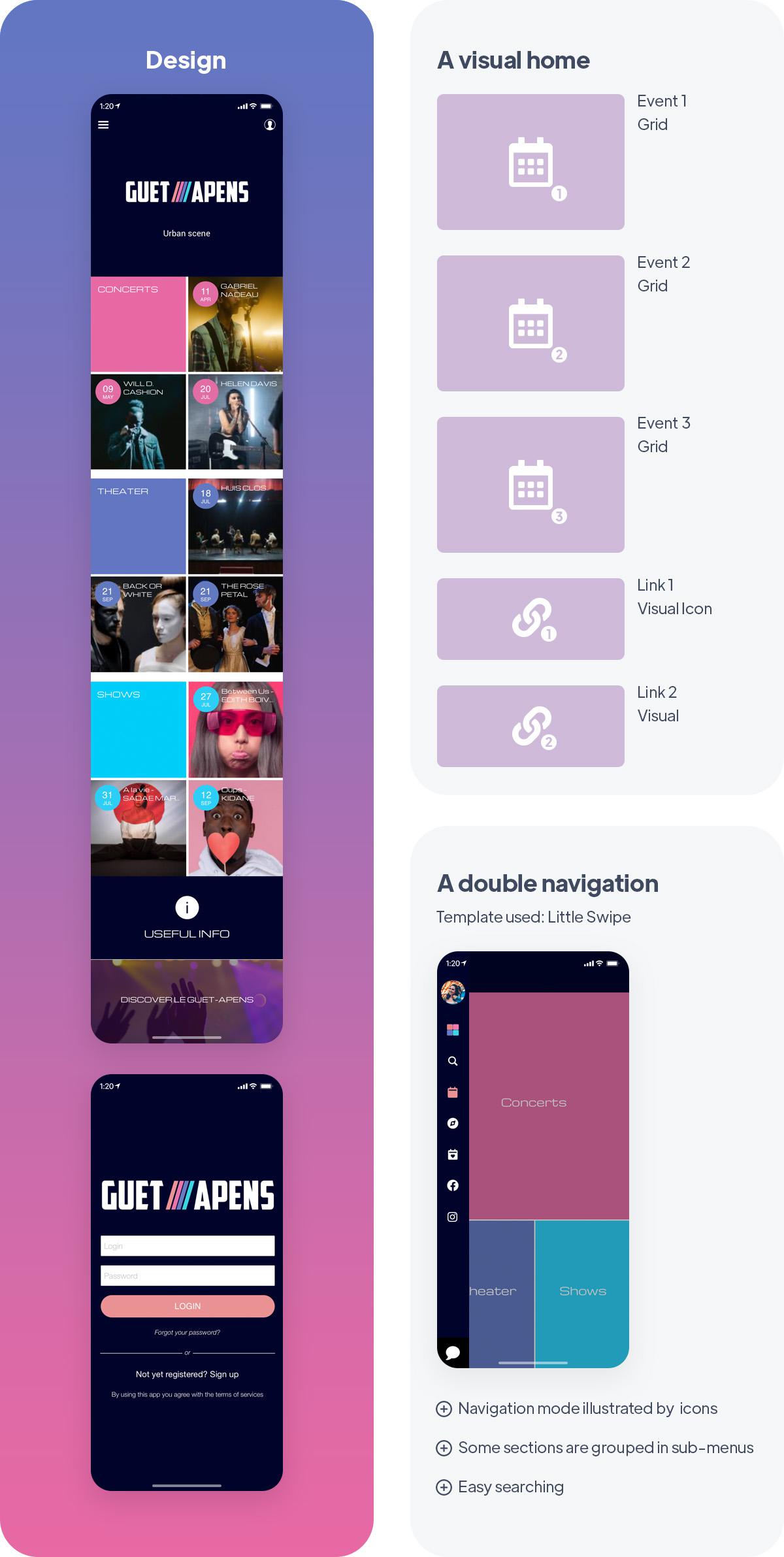 Guet Apens ist eine App für einen städtischen Veranstaltungsort, die verschiedene Zielgruppen anspricht, da hier verschiedene Veranstaltungen angeboten werden: Konzerte, Theateraufführungen und verschiedene Shows.Das Design der App greift die Codes der städtischen Szene auf: